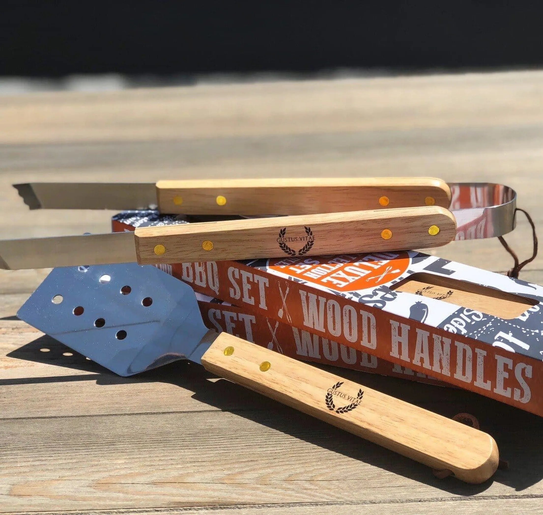 Crafted with heavy duty stainless steel with rubberwood handles, this wooden set is durable and utilitarian while handsomely sporting the Gustus Vitae logo. Both utensils have a handy leather strap too for storage convenience and to keep it proximate while cooking and grilling. The tongs have serrated edges to help your grip.