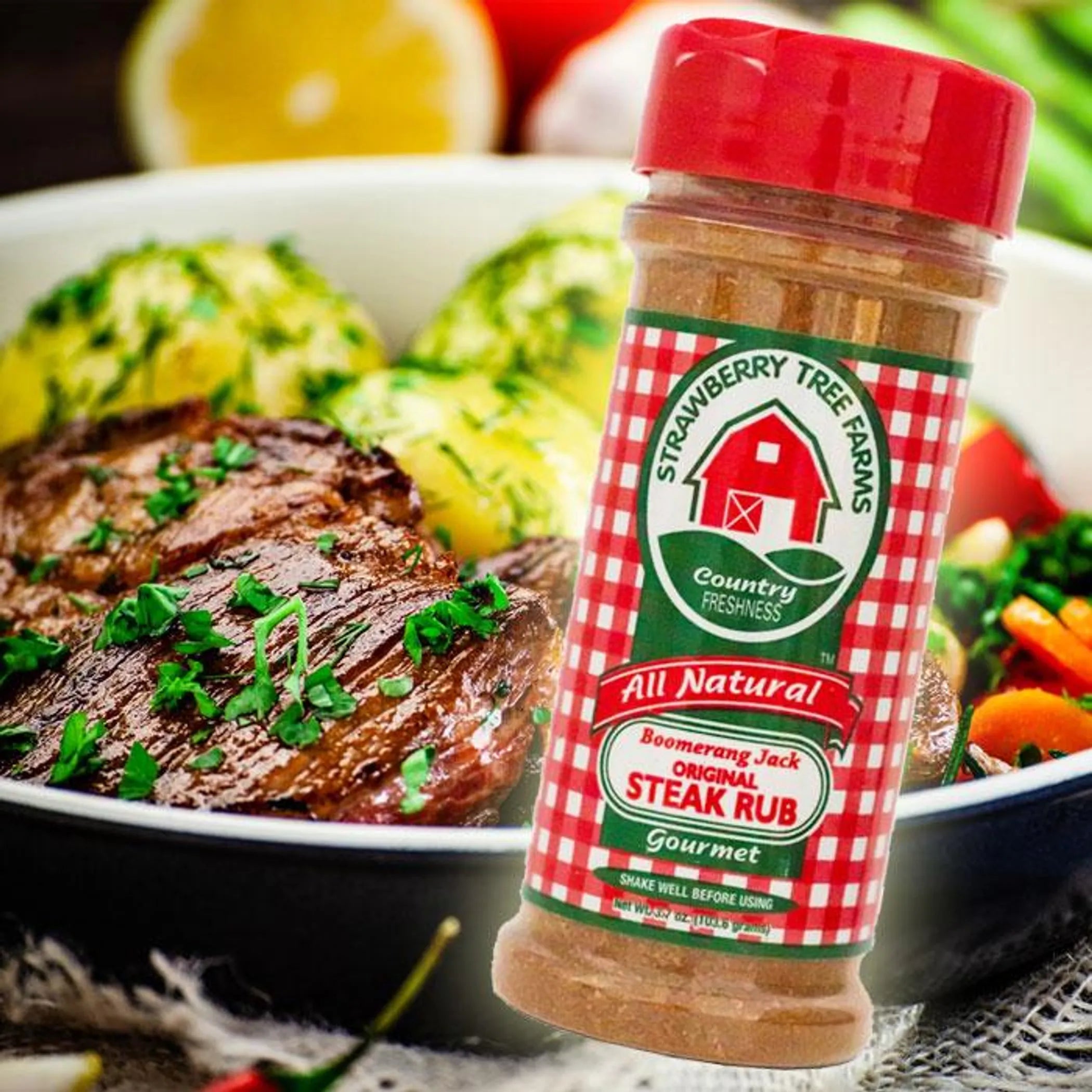 "With this great down-under taste, each bite of your steaks and chops will be heavenly. You'll enjoy Boomerang Jack so much, you are sure to develop an Australian accent. 'G' day mate!" Nutritional Information No MSG No Sugar No PreservativesHere's all you do:MARINADE FOR STEAKS & CHOPS: 1 Tbl. Lemon Juice, 3 Tbl. Olive Oil, 1 Tbl. (or to taste) Boomerang Jack Steak RubPARTY DIP Mix 1 tsp of Boomerang Jack with 3/4 cup of sour cream and 1/4 cup of mayonnaise. OR, substitute 1 cup of whipped cream cheese with just enough sour cream to make it easy to mix (or to taste)Ingredients: Salt, Paprika, Black Pepper, Garlic, Onion, Cayenne Pepper, Turmeric, & Coriander, 85 mg of sodium per 1/4 TSP serving.Herbs, Spices & Flavors Beyond the OrdinaryThe right herbs, spices, and seasonings bring your gourmet cooking to another level. Spice up your favorite home-cooked entree's and side dishes or give a wonderful new twist to family favorites. Explore all our gourmet herbs, spices, seasonings and flavors today.